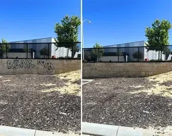 “Vandalized brick facade—before and after. Graffiti completely gone, color preserved, and business reputation restored. Ask about routine maintenance!”